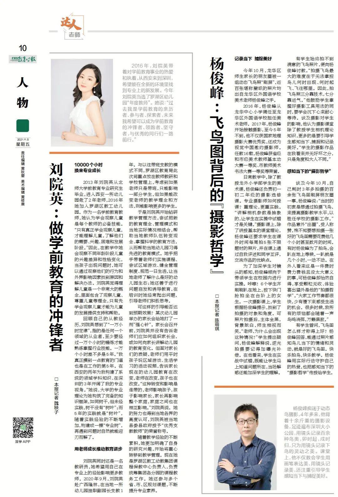 回顾自己的从教经历,刘院英想到了“一万小时定律”,指的是任何一个领域的从业者,至少要经过一万个小时的锤炼才能熟练掌握行业技能。一万个小时差不多是5年。“我真正摸到一点教育的门道也是在工作的第5年。在西安的两年为我构建了系统的领域学科知识、在深圳的3年开阔了我的专业视角。”她说,大学的专业理论为她构筑了完备的知识框架,如同树干,但未经实践,树干没有“树叶”;而5年的实践就是“树叶”,随着实践经验的不断增加,构建成一棵“专业树”,再遇到问题时自然就能迎刃而解了。
