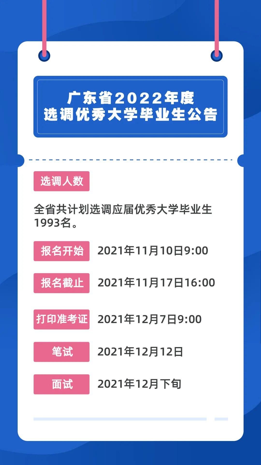 面试时间、地点:面试计划于2021年12月下旬组织,每个职位的面试考点详见《广东省2022年度选调优秀大学毕业生职位表》,具体时间、地点另行通知,请报考者务必保持手机等联系方式畅通。专业测试由省直选调机关和各市公务员主管部门组织实施。