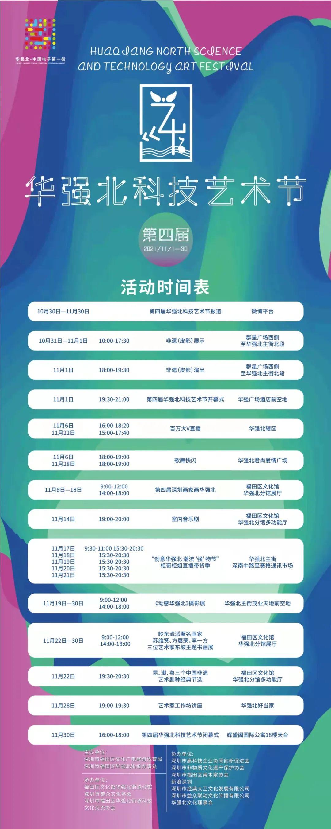 “网红大V”进商圈直播活动,歌舞快闪,第四届深圳画家画华强北室内音乐剧,“创意华强北 潮流‘强’物节”柜哥柜姐直播带货季,《动感华强北》摄影展,岭东流派著名画家苏维贤、方展荣、李一方三位艺术家东坡主题书画展,昆、潮、粤三个中国非遗艺术剧种经典节选,艺术家工作坊讲座等精彩活动,将带给市民一场科技加艺术的文化盛宴。