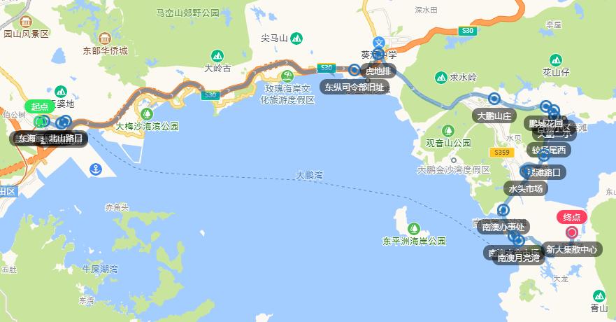 盐田路地铁站、东海丽景花园、盐田派出所、北山路口、东纵司令部旧址、虎地排、大鹏山庄、鹏城花园、古城小区、大鹏二小、较场尾西、银滩路口、水头市场、南澳办事处、南澳水产市场、南澳月亮湾、新大集散中心