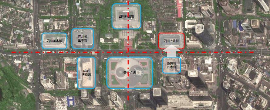 四川大剧院位于成都市的街坊广场,科技馆和天府广场作为中轴线,四川大剧院位于中轴线东侧。