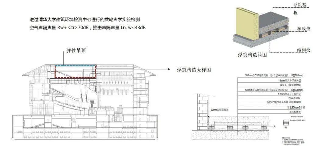 大小剧院的重叠创新设计,叠加在大剧场上空的小剧场采取浮筑楼板、墙面和弹性吊顶等方法合理解决了相互声音振动干扰的问题。
