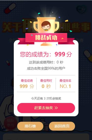 用户每次进入答题,将被随机分配5道题,每道题20分,总分为100分,每次答题成绩达到60分,即为挑战成功,可参与抽奖;