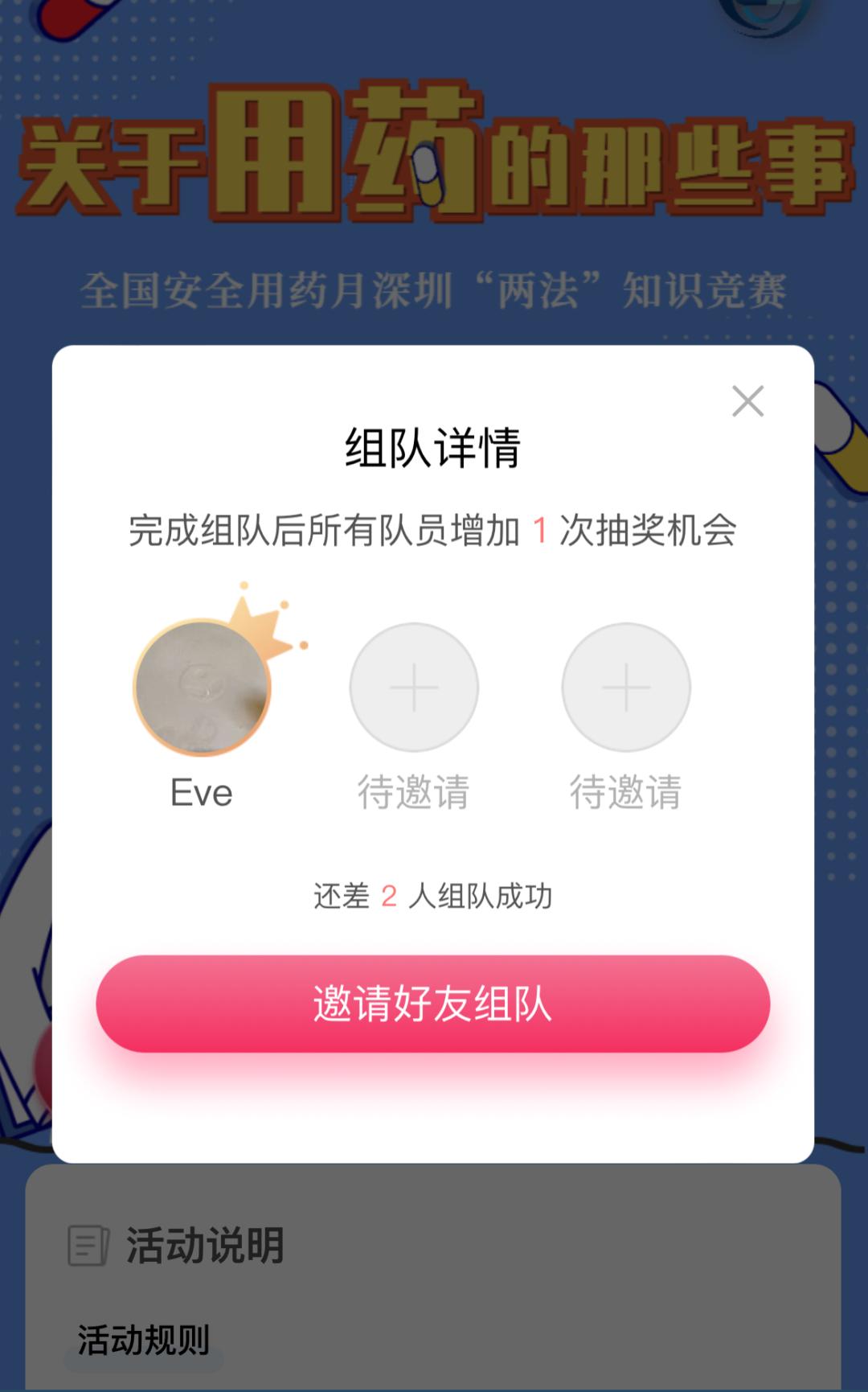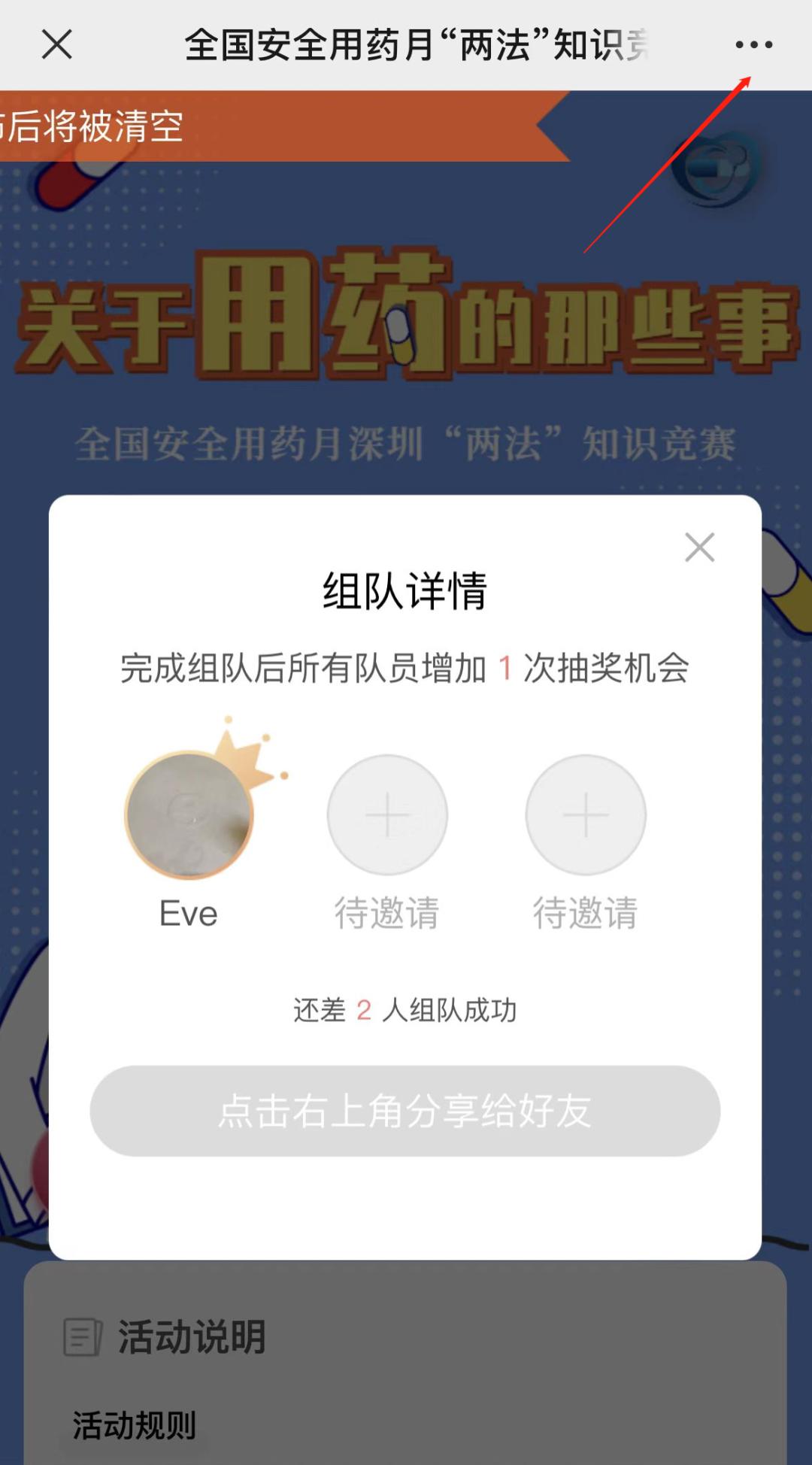 3. 点击页面右上角分享给微信好友,成功组成3人队伍后,组内所有成员即可额外获得1次抽奖机会。