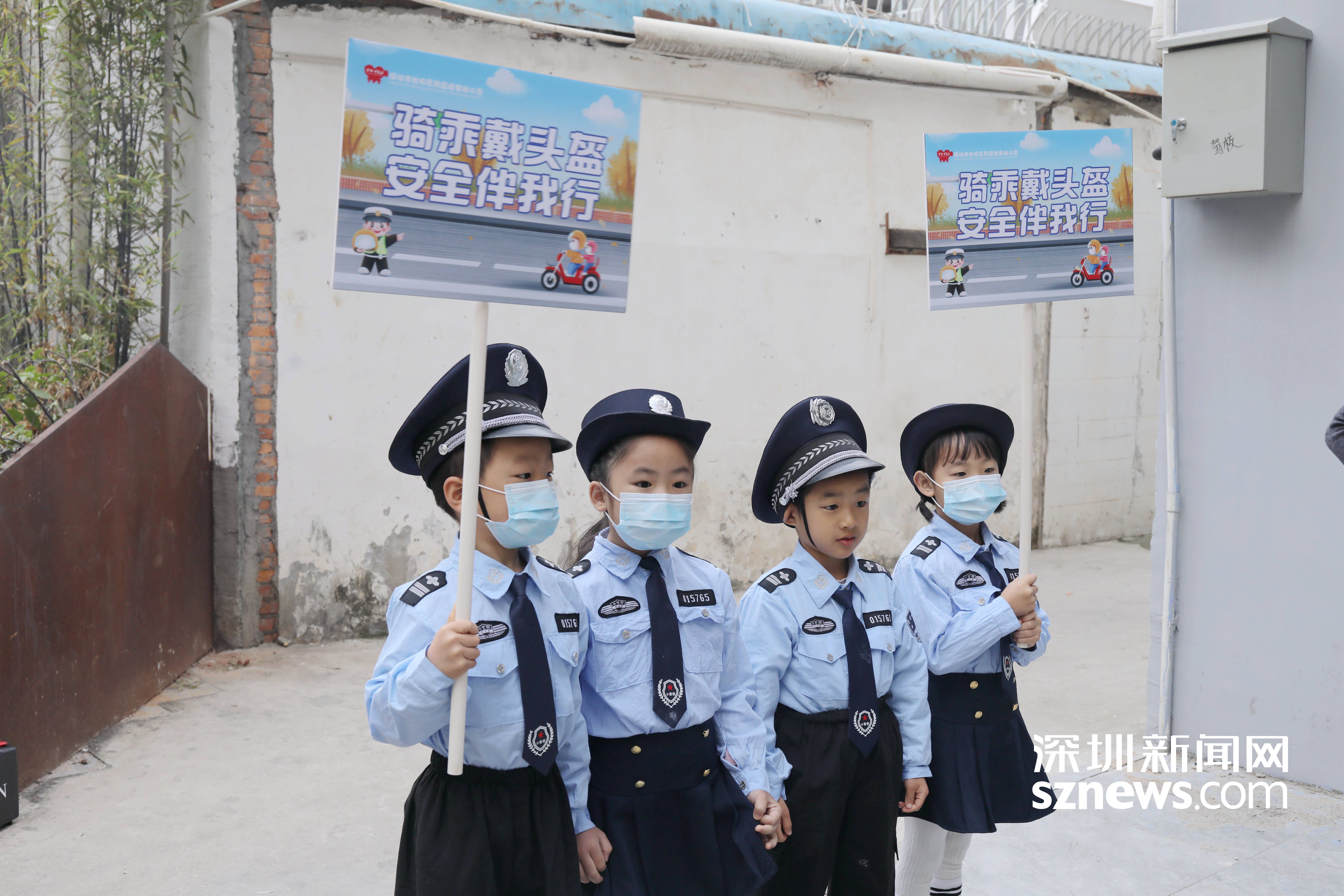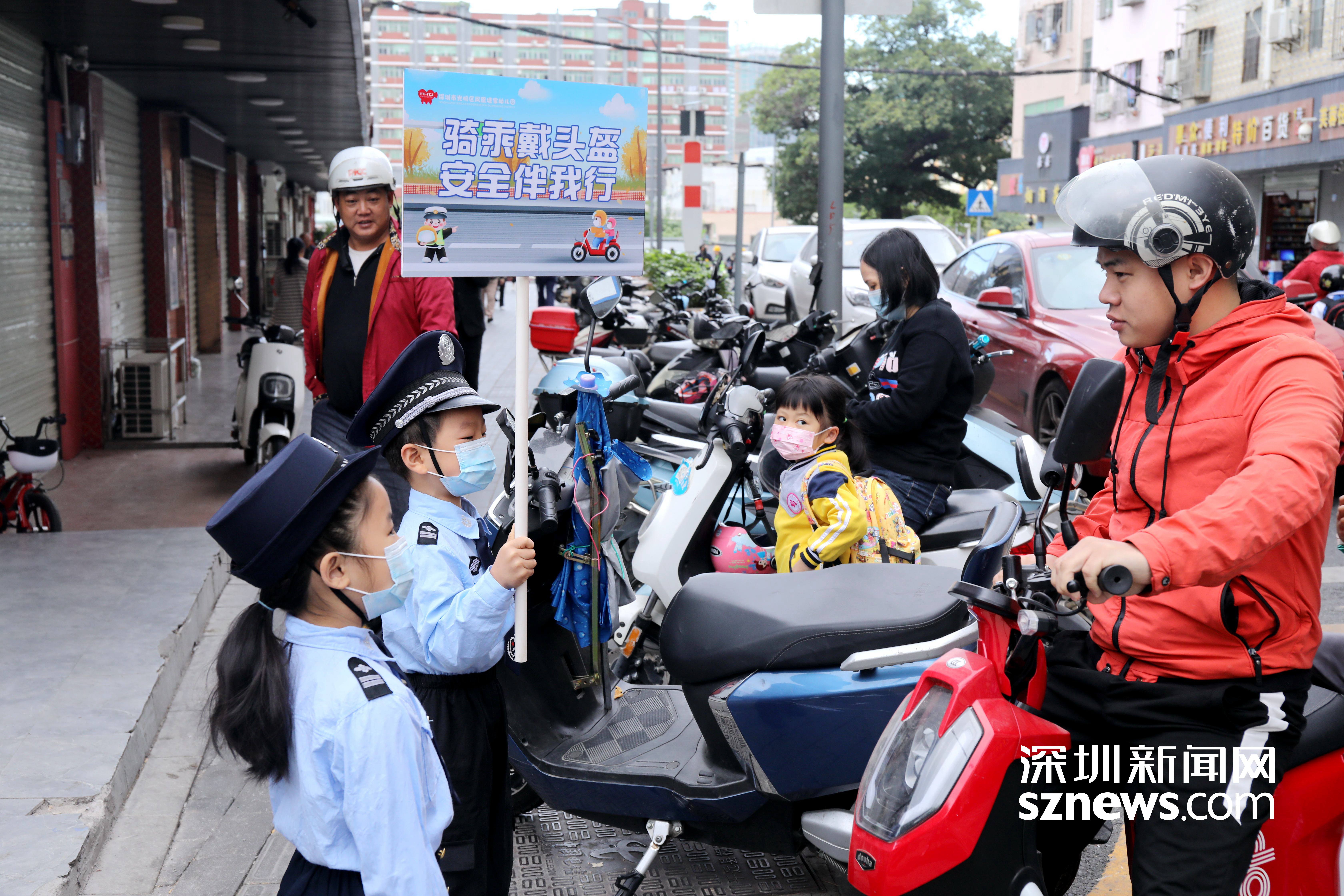 读特客户端·深圳新闻网2021年11月11日讯(记者 林秋颖 麦乐瑶 通讯员 雷云霞)“阿姨,请您佩戴好头盔……”“噢!不好意思,小朋友,阿姨明天一定戴头盔。”这个学期每天上学放学期间,塘家幼儿园门口都能见到一群统一着装的“小交警”在忙碌地“执勤”,用专注的神情,响亮的声音,对没有佩戴安全头盔的骑乘电动车的家长们,进行劝导提醒。