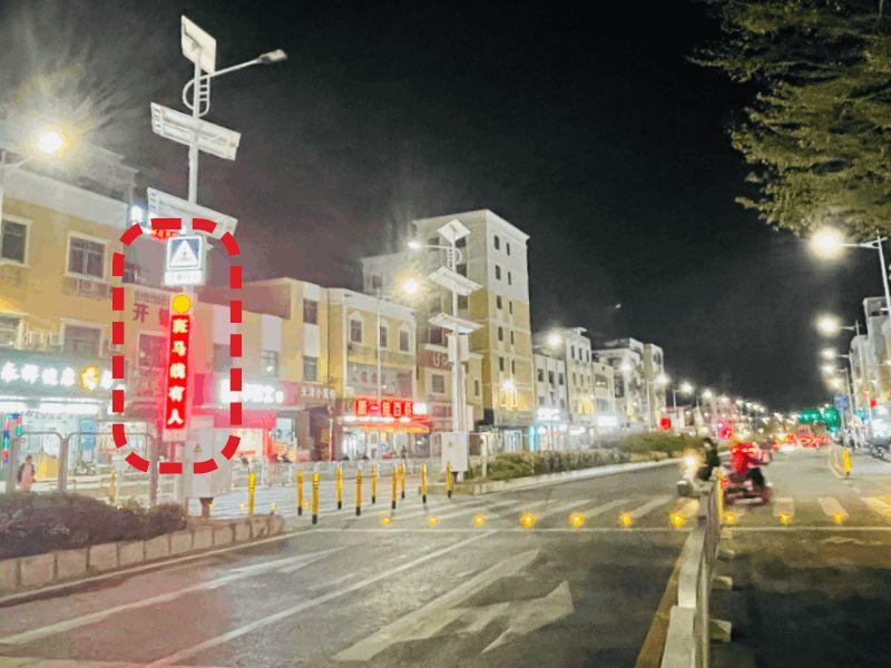在路口斑马线中间,面对车辆进口方向分别安装了4组分级提示的太阳能慢行提示黄闪灯和1组太阳能斑马线AI检测行人预警系统;