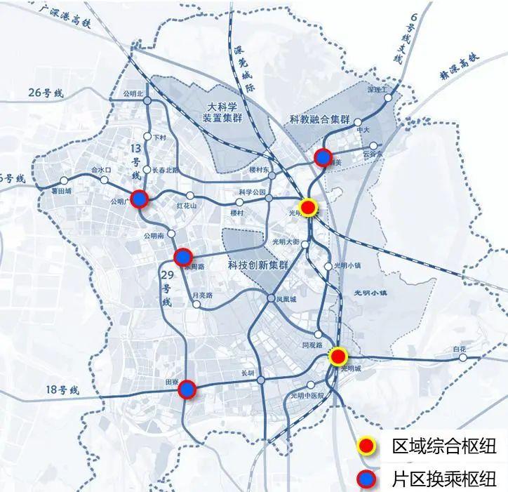 构建一体化综合枢纽体系。推动光明城站和光明站2个综合枢纽建设,加快公明广场站、玉塘站、中大站、东周路站4个换乘站工程。