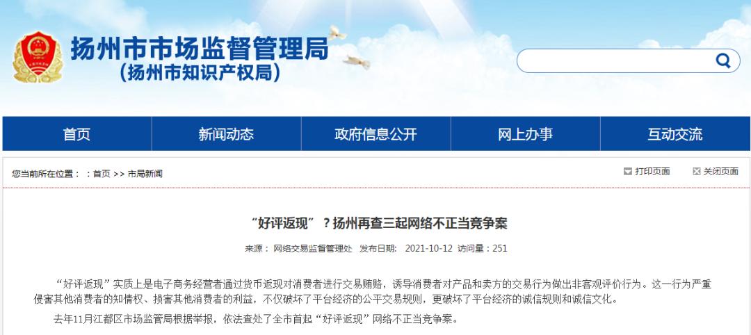 10月12日,扬州3家餐饮店因在外卖内放置“好评返现卡”已被扬州市市场监管局立案处罚。