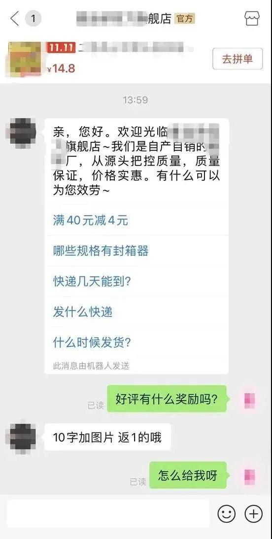 调查发现,目前多家电商平台上已屏蔽“好评返现”等关键词搜索,但联系一些商家客服后,就会得到“10字加图片返1”“返3”等回答,好评返现暗中存在。
