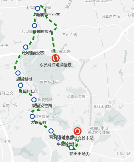 观景路公交首末站、新田市场①、牛轭岭新村、观澜建材市场、大布新村、观澜交管所、蚌岭村口、庙溪新村、沙湖治安亭、沙湖村委会、塘厦第三小学、东莞珠江观澜御景