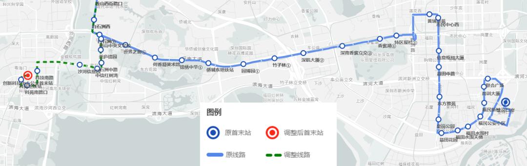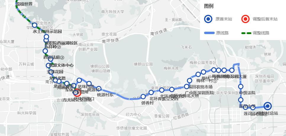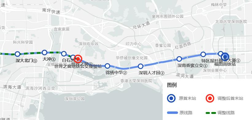调整之后,395线缩短至世界之窗地铁公交接驳站,受影响的乘客可通过101线、113线、204线、M413线等多条深南大道沿线公交车或地铁1号线替代出行。
