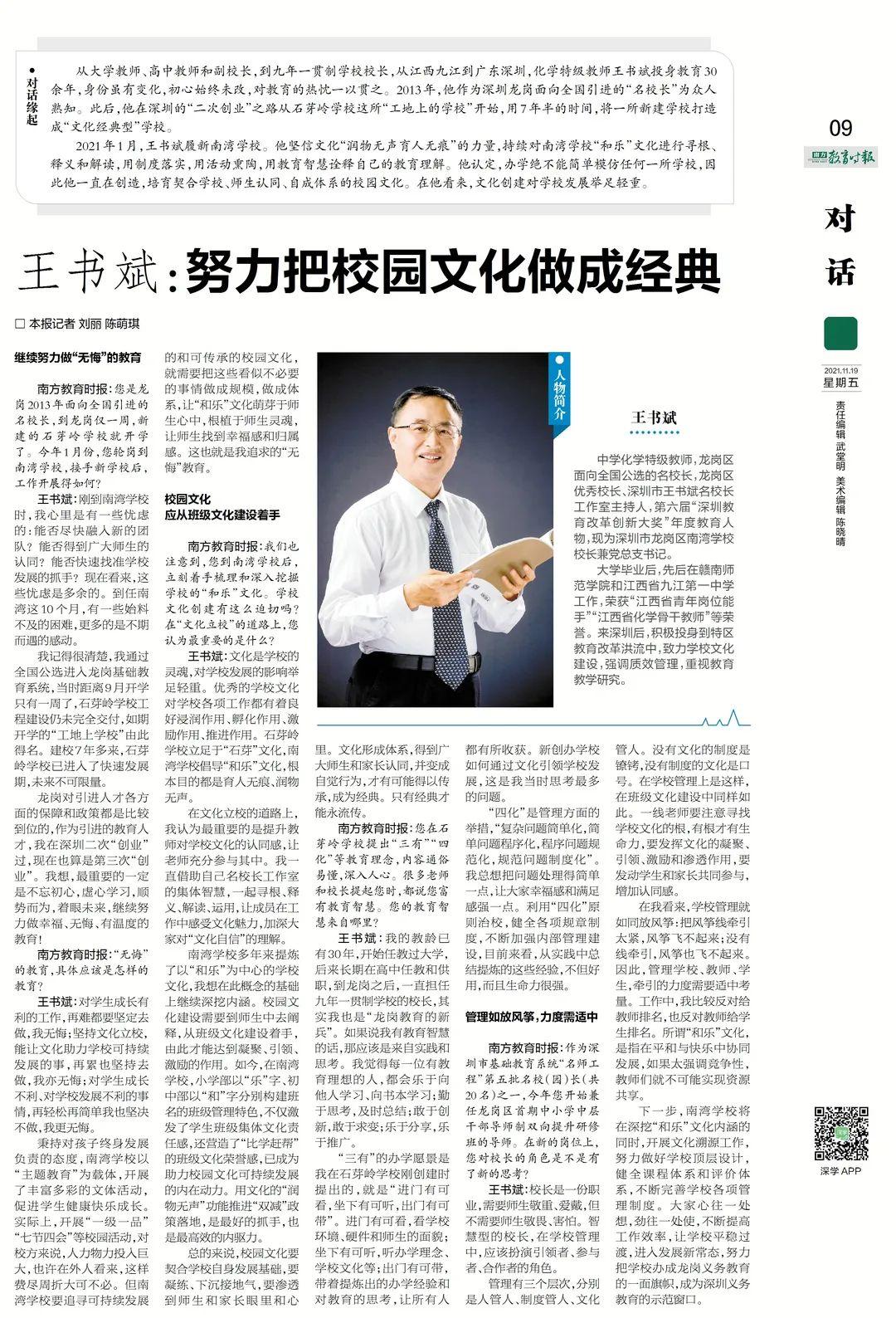 王书斌:我的教龄已有30年,开始任教过大学,后来长期在高中任教和供职,到龙岗之后,一直担任九年一贯制学校的校长,其实我也是“龙岗教育的新兵”。如果说我有教育智慧的话,那应该是来自实践和思考。我觉得每一位有教育理想的人,都会乐于向他人学习、向书本学习;勤于思考,及时总结;敢于创新,敢于求变;乐于分享,乐于推广。