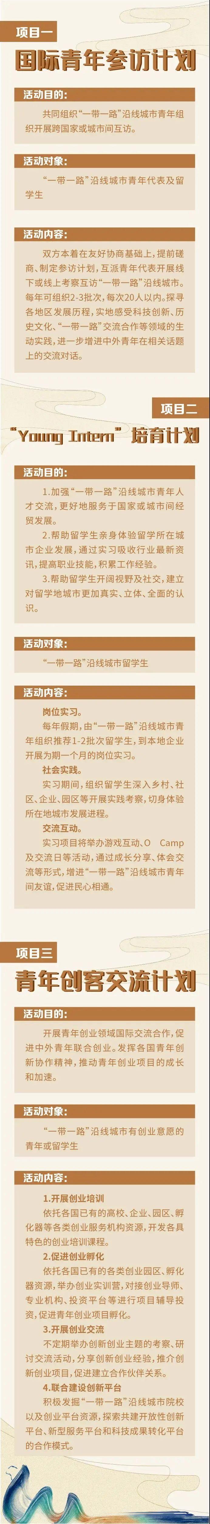 现场还启动了“一带一路”沿线城市海外实践项目,主要围绕国际青年参访计划、“Young Intern”培育计划、青年创客交流计划等务实创新的合作项目,以促进“一带一路”沿线城市青年合作从“大写意”转向“工笔画”,推动古丝绸之路焕发出新时代的青春光彩。