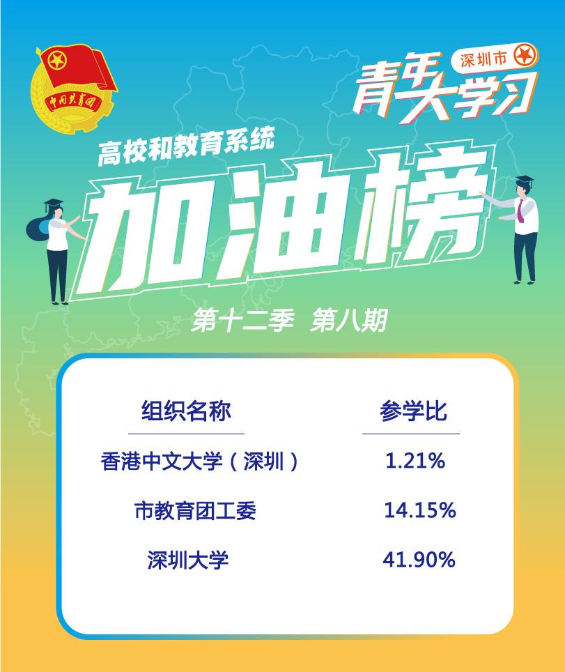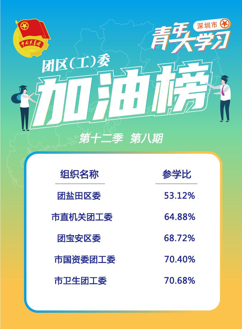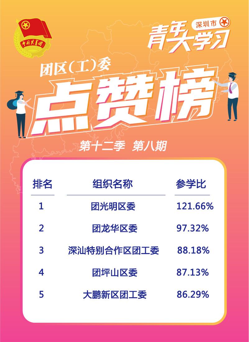 从深圳各团区(工)委参学情况看,光明、龙华、深汕、坪山、大鹏达80%以上,提出表扬!低于70%的单位,在接下来的学习中需进一步努力,争取取得更好的成绩!