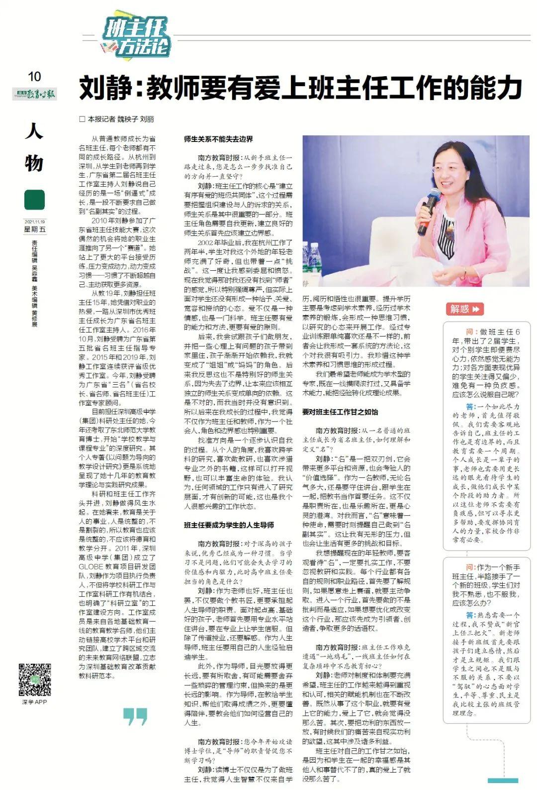 从教19年,刘静担任班主任15年,她凭借对职业的热爱,一路从深圳市优秀班主任成长为广东省名班主任工作室主持人。2016年10月,刘静受聘为广东省第五批省名班主任指导专家。2015年和2019年,刘静工作室连续获评省级优秀工作室。今年,刘静受聘为广东省“三名”(省名校长、省名师、省名班主任)工作室专家顾问。