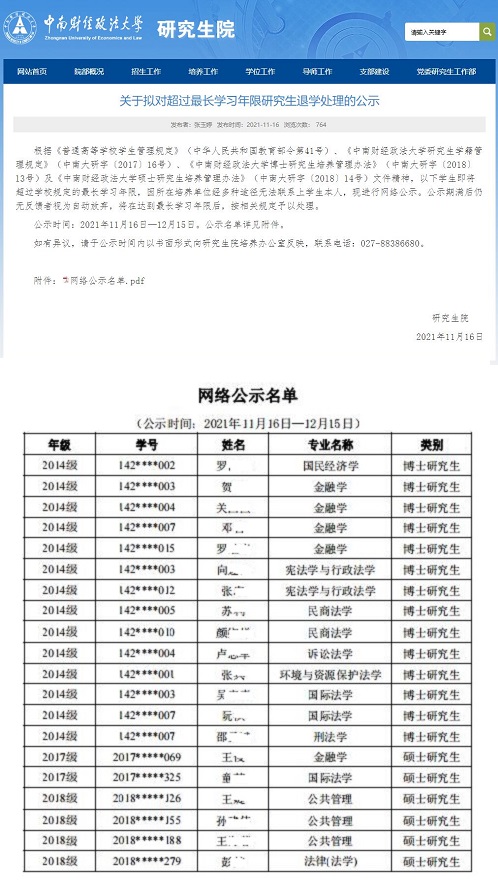 11月16日,中南财经政法大学研究生院在其官方网站发布《关于拟对超过最长学习年限研究生退学处理的公示》。公示名单显示,共有20名研究生被列入了拟清退名单,其中博士生14名,硕士生6名。拟被清退的14名博士生均于2014年入学,所读专业为国民经济学、金融学、宪法学与行政法学、民商法学、诉讼法学、环境与资源保护法学、国际法学、刑法学等。拟被清退的6名硕士研究生来自金融学、国际法学、公共管理、法律(法学)等专业,有4人是2018年入学,2人是2017年入学。