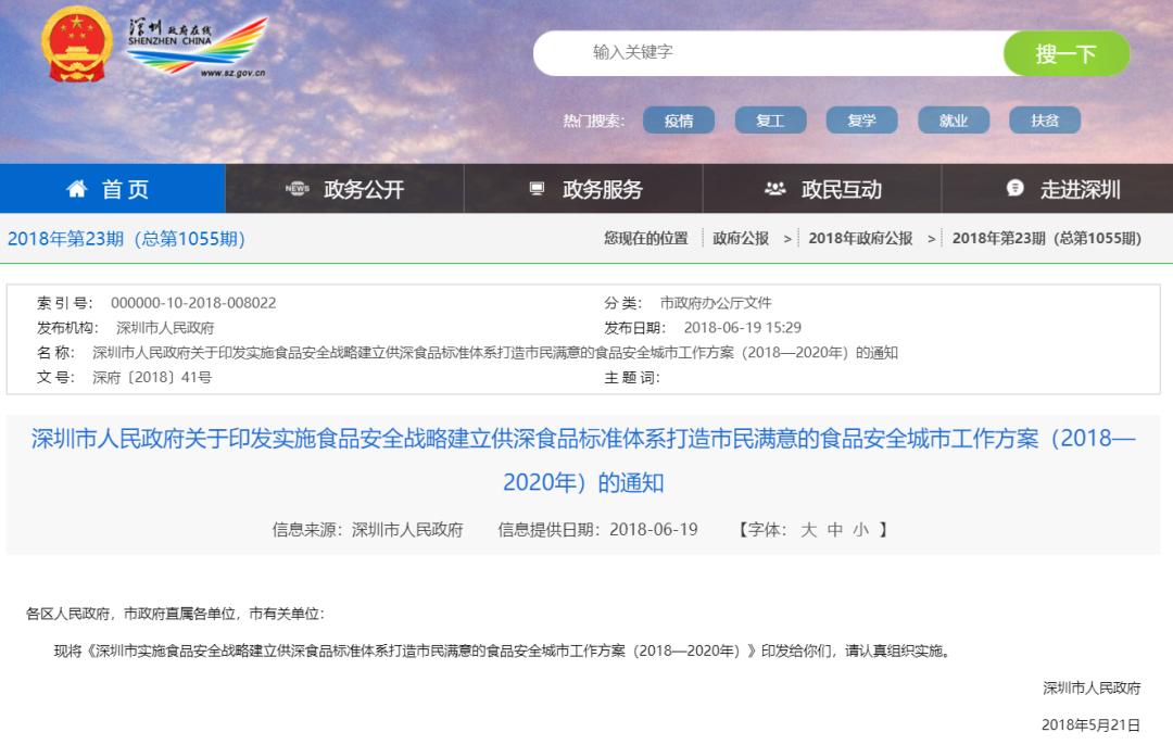 2018年5月21日,深圳市人民政府印发《深圳市实施食品安全战略建立供深食品标准体系打造市民满意的食品安全城市工作方案(2018—2020年)》,全面推进政府、企业、社会各方协同共治,督促企业落实主体责任。