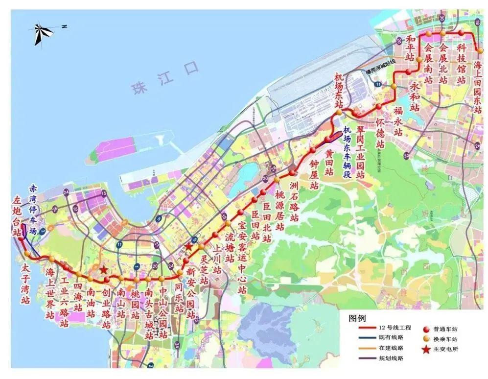 深圳地铁12号线起自南山区左炮台站,自南向北穿越南山中心区、宝安中心区、福永片区、大空港及会展片区后,终至宝安区海上田园东站。