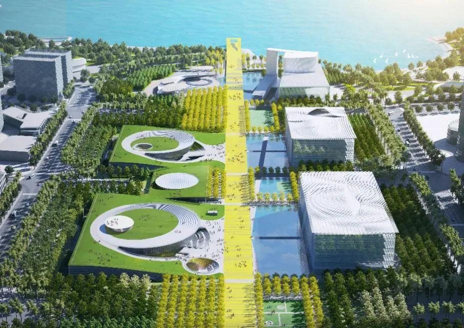 宝安中轴公园作为串联绿地系统的门户轴线,将进一步完善与提升中心区公共空间质量,树立区域范围内重要的城市生态核。深圳书城湾区城(含湾区民俗馆)选址在中轴公园的中心位置。在这个临海的城市客厅,文化作为人文因素融入并参与其中的部分,将在这里以建筑为载体得以呈现。