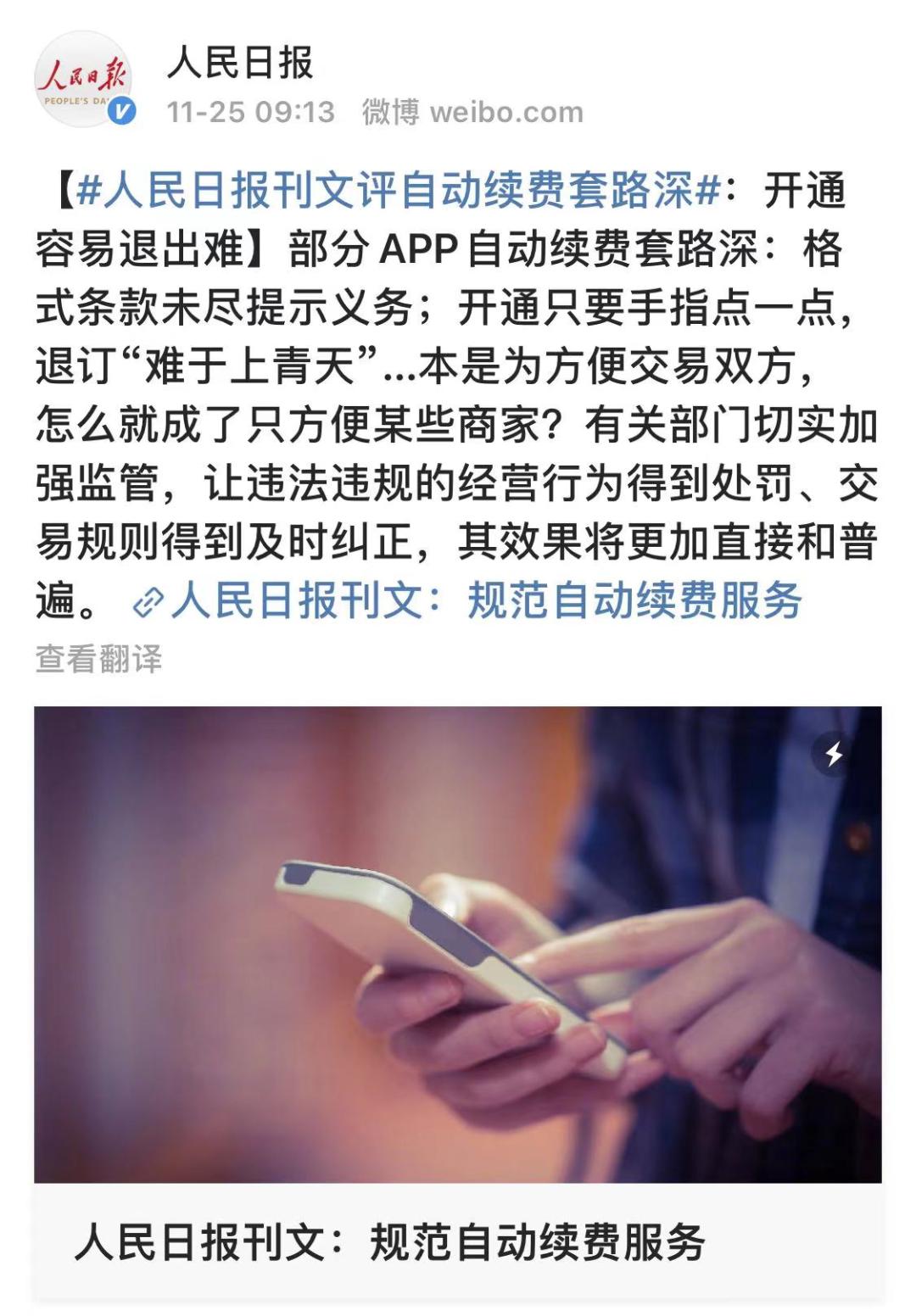 人民日报刊文:规范自动续费服务