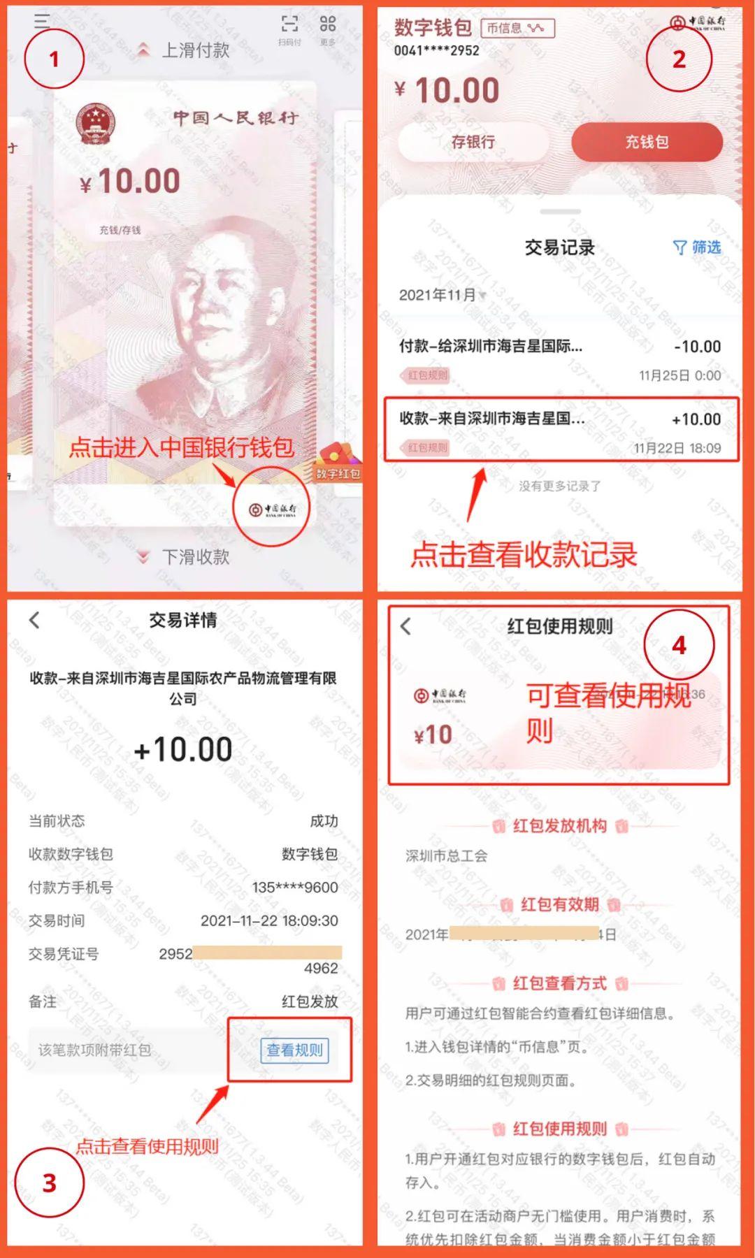 帮扶消费券查看路径:登录数字人民币App,查看“中国银行钱包”-交易记录-收款-内页显示“红包发放”字样下方处“查看规则”。