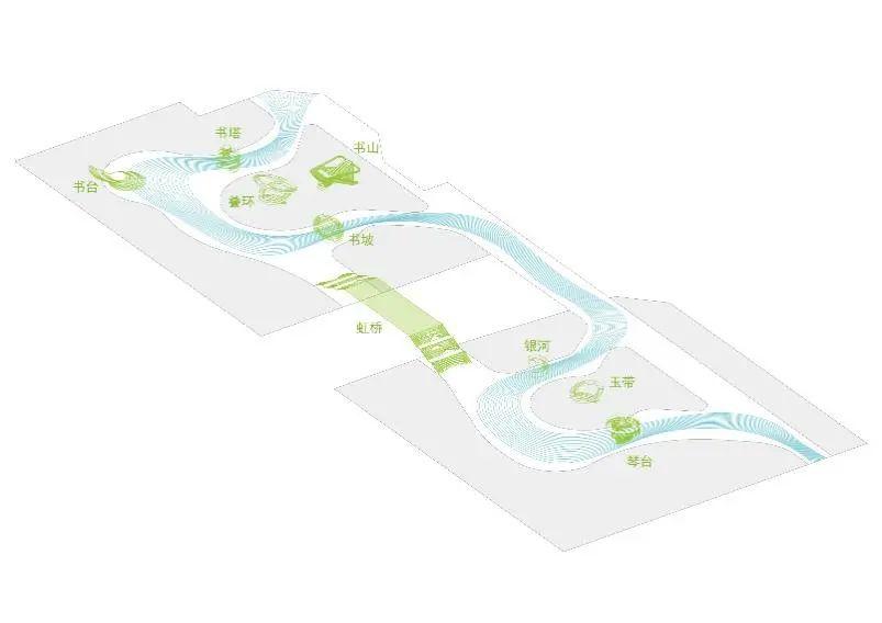 中轴公园的西侧是商务区,东侧是商业、居住、办公的复合开发区。这些各异的功能区围绕着中轴公园形成了差异化的城市界面,与公园共同构成了复合且立体的绿色都市构架。