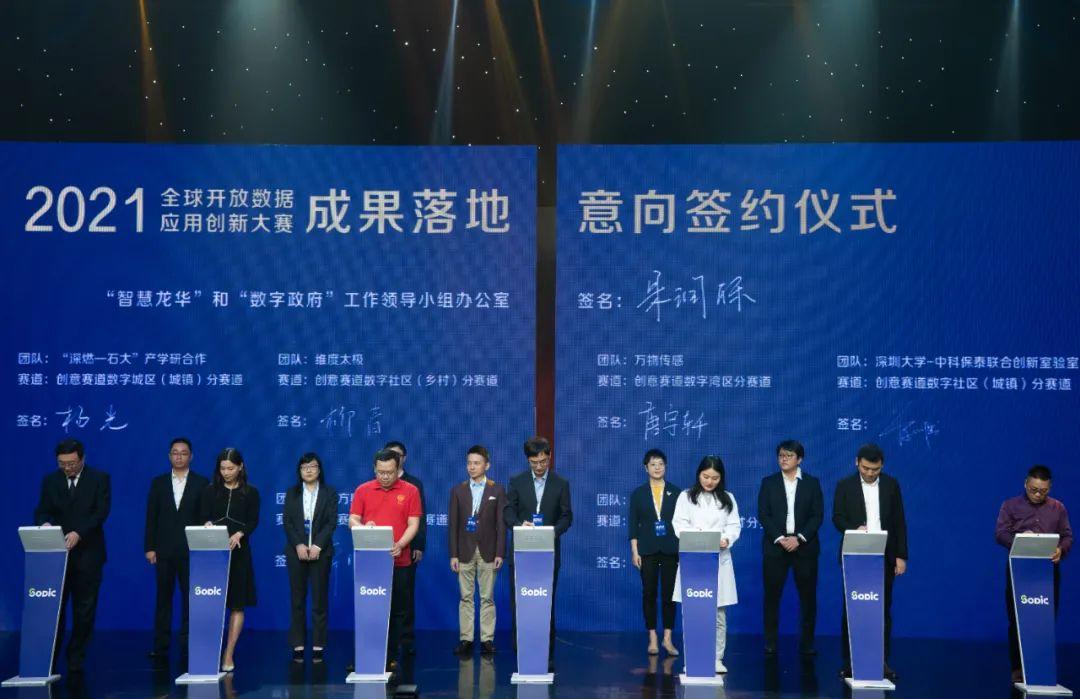 当晚的成果分享汇以“无限·畅享”“无限·智享”“无限·创享”三个篇章,集中展示了2021SODiC全球开放数据应用创新大赛的丰硕成果。为确保做好疫情防控,现场以“线上线下”结合的方式,发布专业类比赛创意赛道、算法赛道,非专业比赛的畅想赛决赛的所有奖项,并揭晓了本届大赛首次设置的专业类比赛总决赛总冠军。为了更好地推动大赛成果应用落地“揭榜挂帅”,在赛道、赛题承办单位的指导下,作为大赛承办单位之一的深圳市龙华区与6支优秀参赛团队进行了意向合作签约。当晚的活动中还特别邀请部分优秀选手进行作品展示和推介。活动的最后,大赛再次向全球发出2022年的赛事邀约。