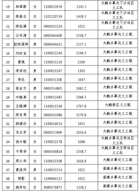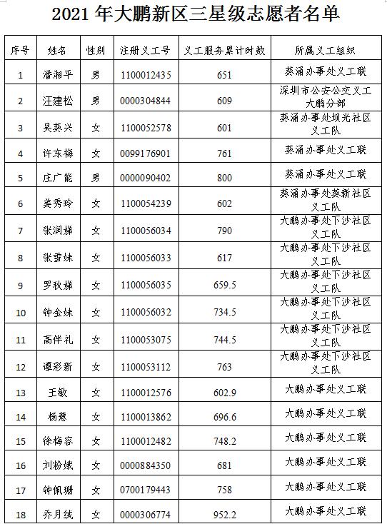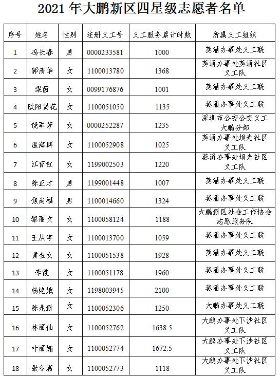大鹏新区三星、四星级志愿者认证结果
