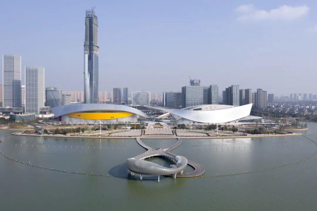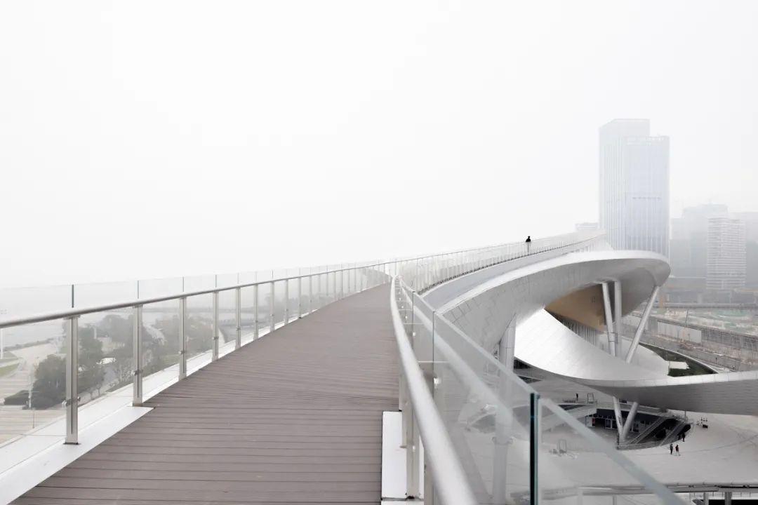 建筑师还巧妙地在飘带上设置了人行通路:飘带上有一条40米高的小路,从那里可以俯瞰整个城市和苏州太湖水天一色的独特景致。这种移步换景的建筑体验恰好与体验苏州园林的美感相似。