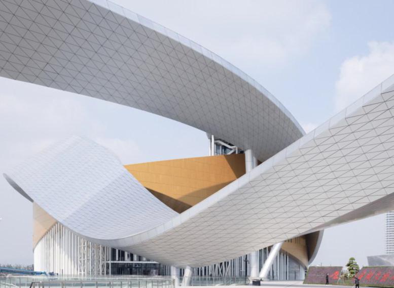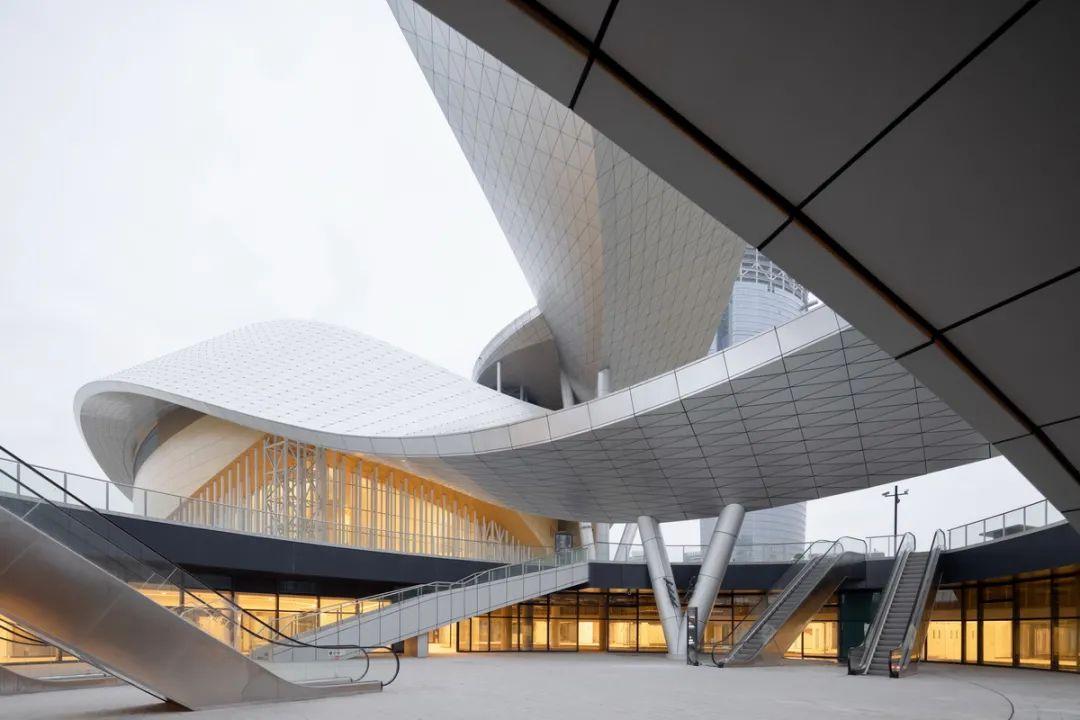 有别于现代主义的方盒子,建筑师设计了一根长条状的“飘带”,形如“∞”,从建筑顶端的一片翅翼绕至另一片,接着越过立面,在距地面高达40米处与行人轴线交叉,以构筑通往湖水的视觉开口,高低两条钢结构飘带交织成极具标志性的建筑特征,既是大剧院的屋顶,也是博览中心的侧壁。