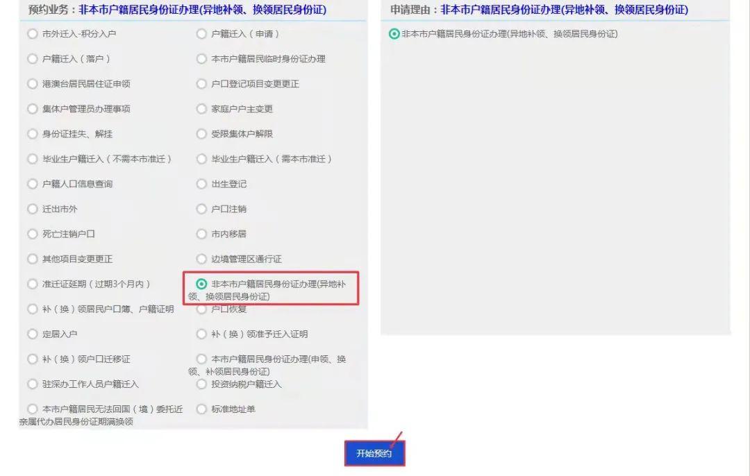 第二步:点击“户政业务”中的“户政预约”选项,选择“非本市户籍居民身份证办理”业务。