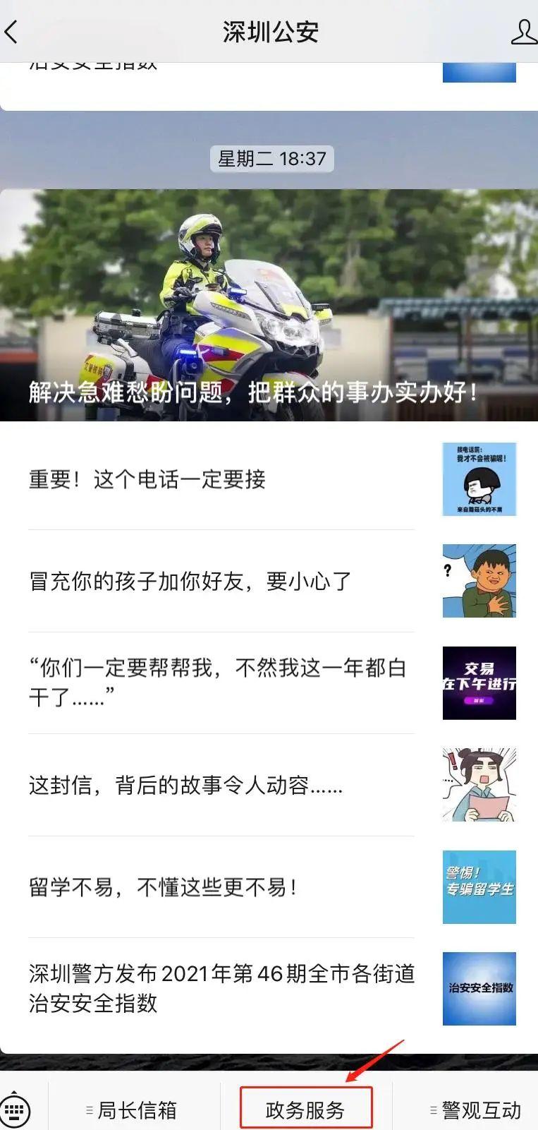 在深圳公安微信公众号选择“警观互动”菜单栏中的“便民互动”;