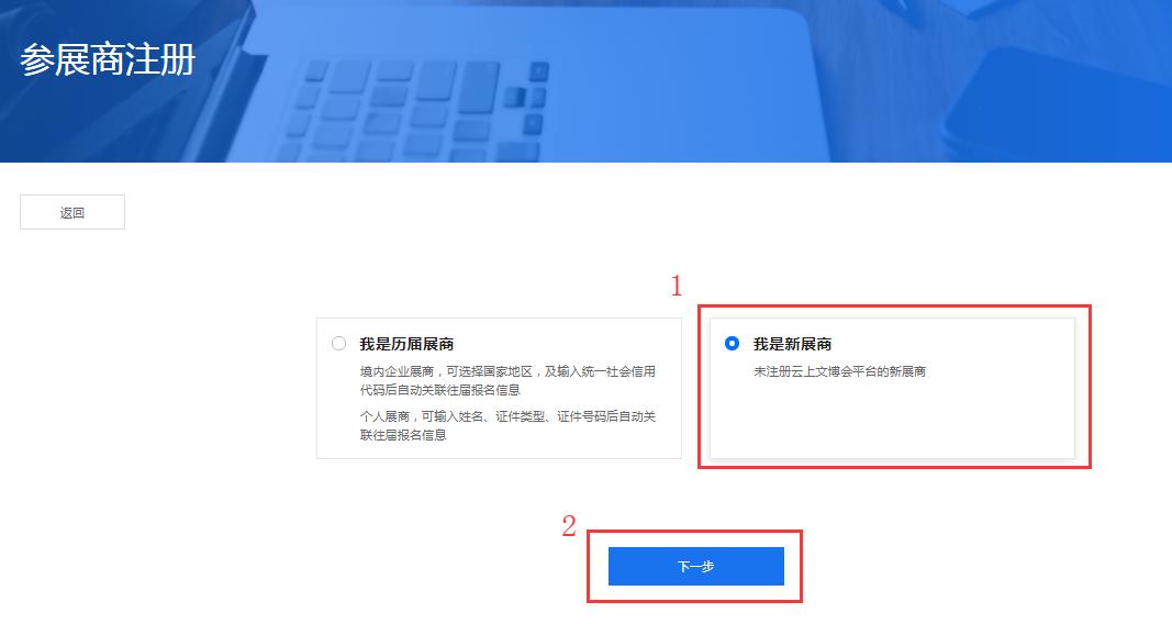 第四步:进入“参展商注册”页面,新展商选择【我是新展商】身份点击【下一步】;