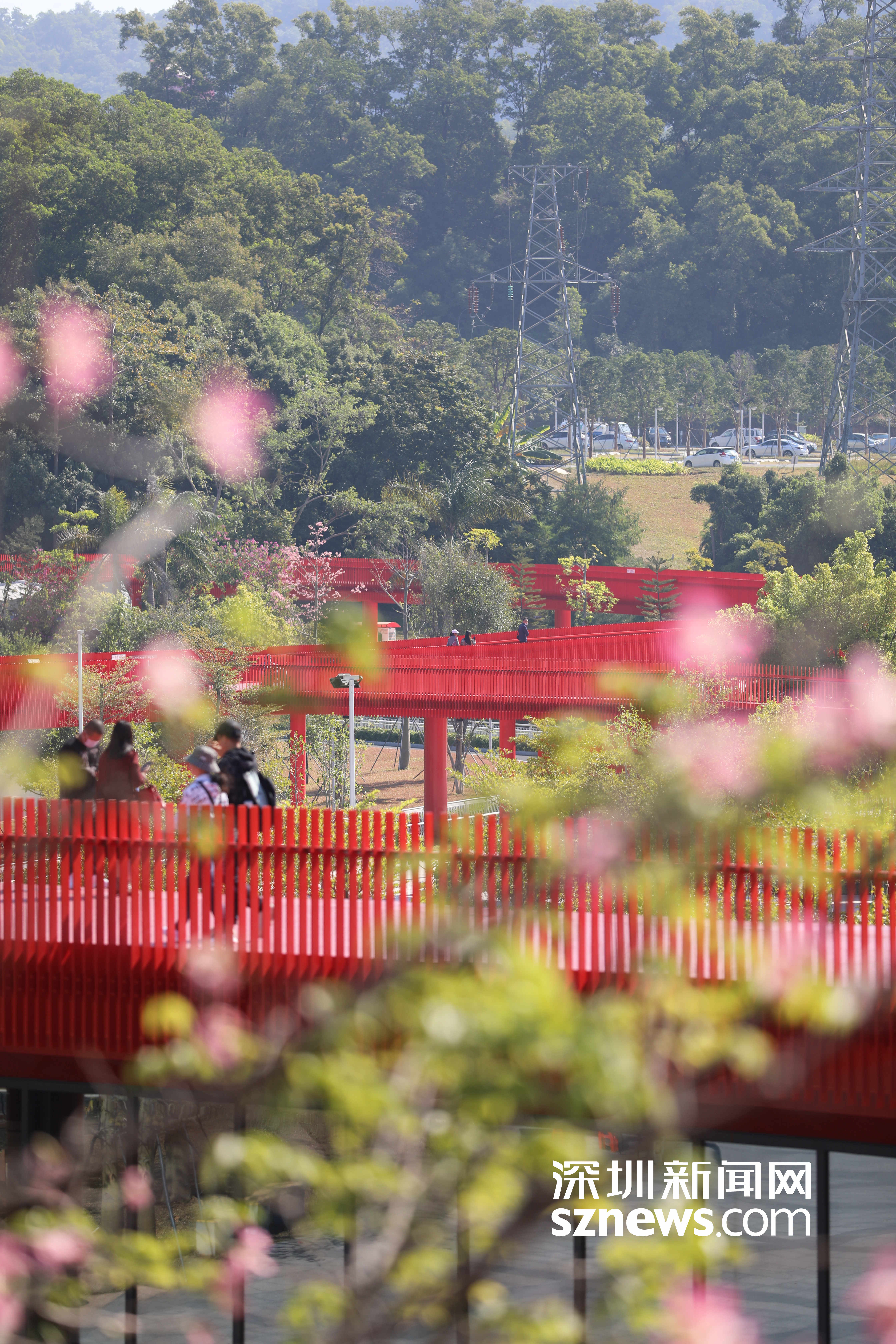 粉色的花绚丽绽放,市民在草坪上休闲。