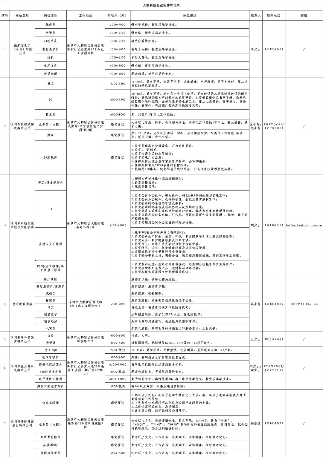 大鹏新区企业招聘信息一览表