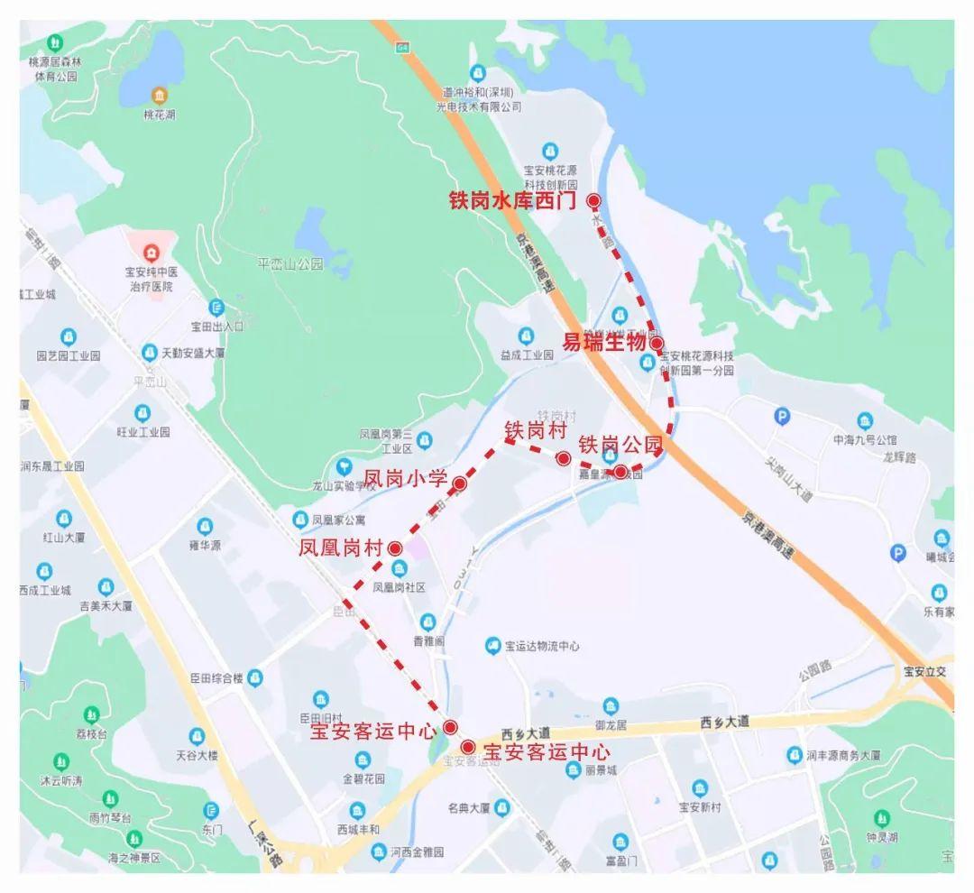 宝安客运中心、凤凰岗村、凤岗小学、铁岗村、铁岗公园、易瑞生物、铁岗水库西门等主要站点。