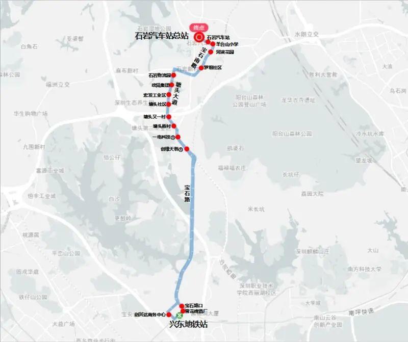 石岩汽车站总站、石岩汽车站、羊台山小学、河滨花园、罗租社区、石岩物流园、欧陆集团、宏发工业区、塘头社区、塘头又一村、塘头新村、一电科技①、创维天桥①、宝石路口、雪花啤酒厂、创兴达商务中心、兴东地铁站。