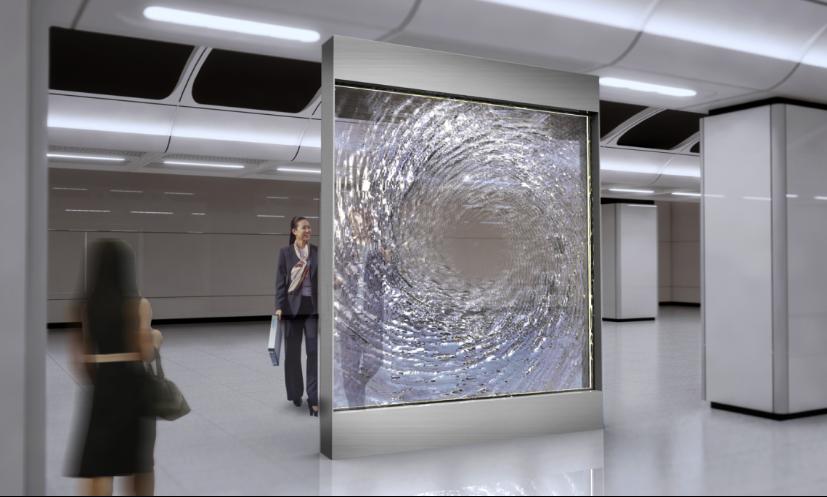 方案利用透光性材料进行内雕图案,将图案分层雕刻;造型既如水流般汇聚在一起,寓意人与信息、金融等的汇聚、交流。