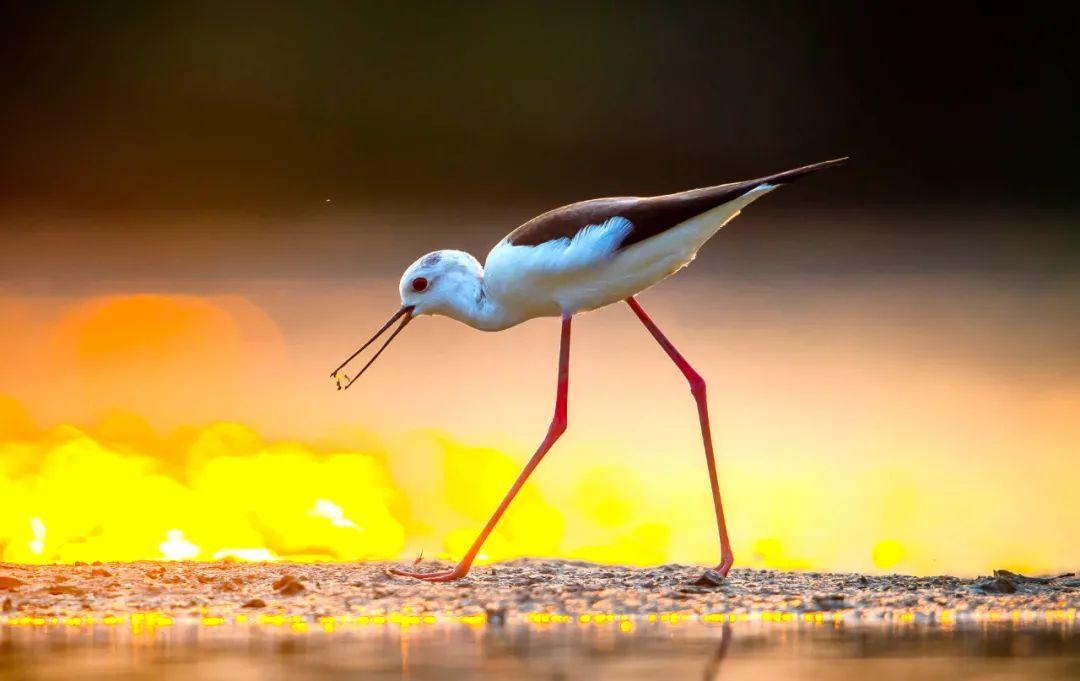 ▲捕捉到猎物的“林志玲”。黑翅长脚鹬,腿长,眼大,抹着淡淡的眼影,走路袅袅婷婷,被观鸟爱好者称为“候鸟里的林志玲”。