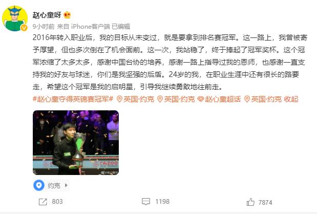赛后赵心童发微博表示:“2016年转入职业后,我的目标从未变过,就是要拿到排名赛冠军。这一路上,我曾被寄予厚望,但也多次倒在了机会面前。这一次,我站稳了,终于捧起了冠军奖杯。这个冠军浓缩了太多太多,感谢中国台协的培养,感谢一路上指导过我的恩师,也感谢一直支持我的好友与球迷,你们是我坚强的后盾。24岁的我,在职业生涯中还有很长的路要走,希望这个冠军是我的启明星,引导我继续勇敢地往前走。”