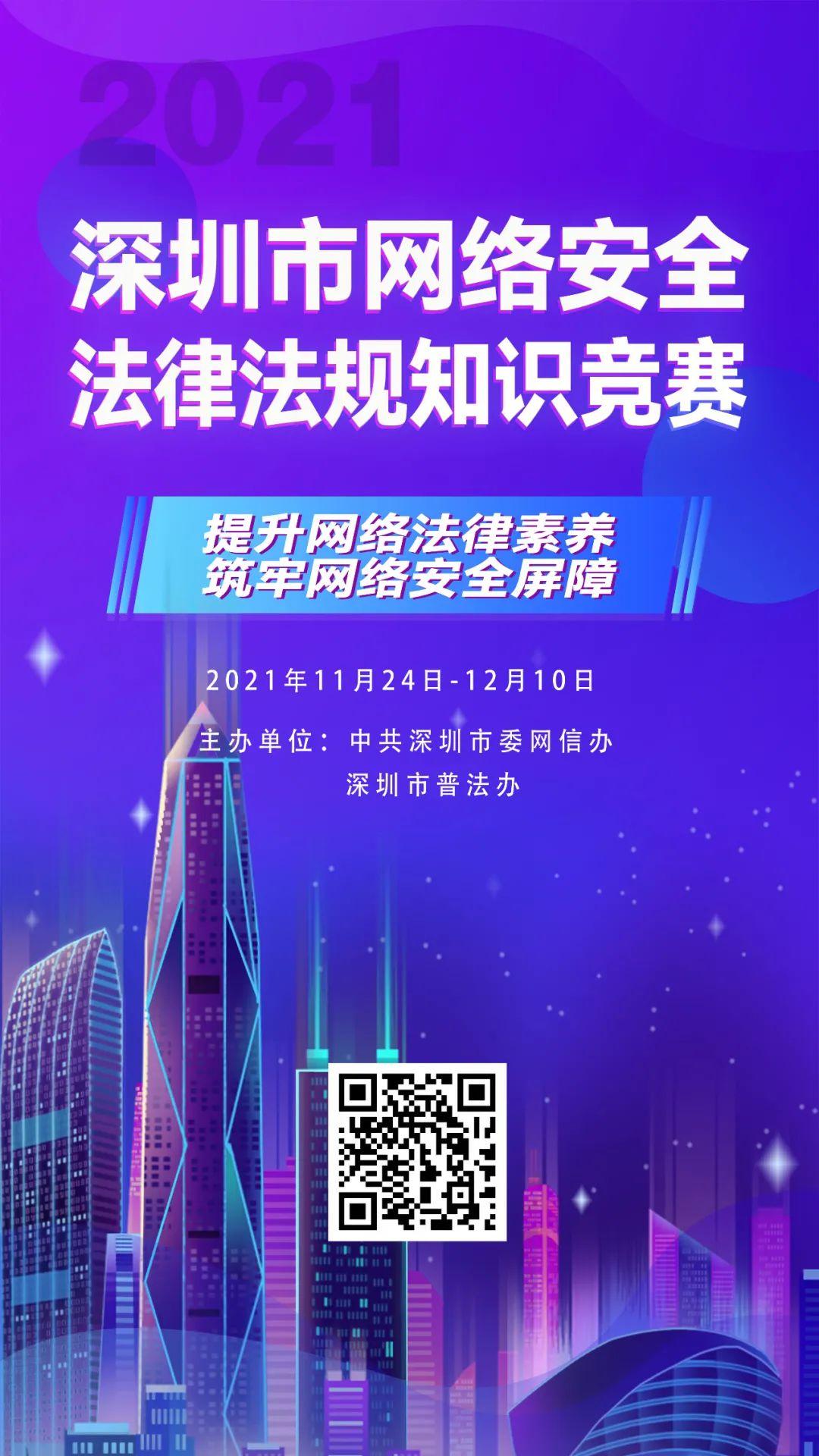 为了鼓励市民主动学习网络安全法律法规知识,提升广大市民的网络安全意识与素养,共筑全社会网络安全屏障,中共深圳市委网信办和深圳市普法办联合开展了2021年深圳市网络安全法律法规知识竞赛活动。