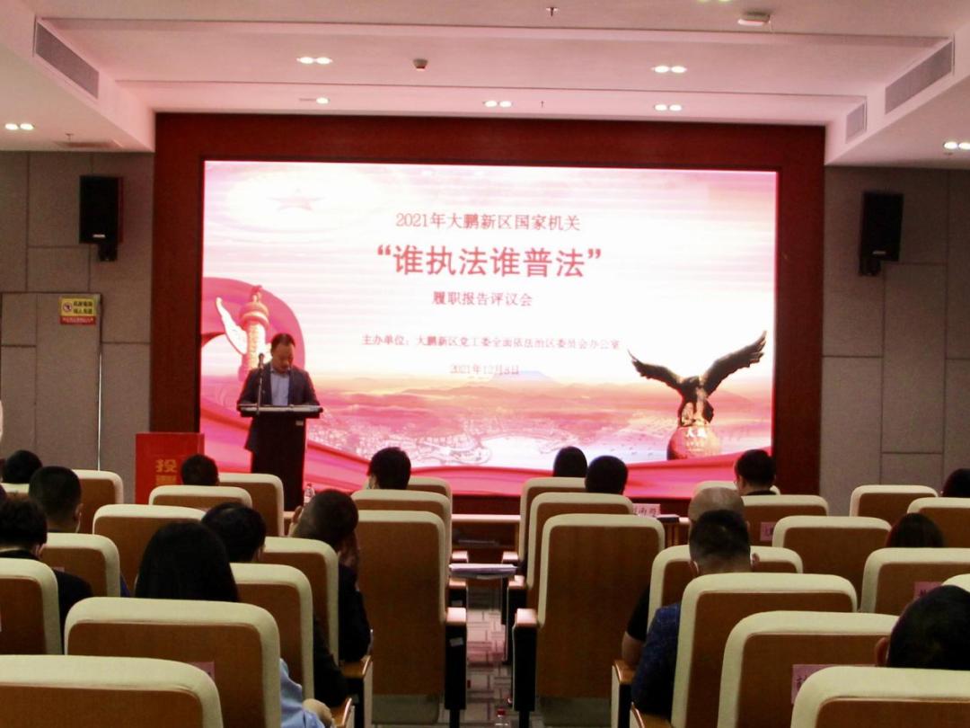 会上,新区城市管理和综合执法局、群团工作部、南澳办事处、市市场监督管理局大鹏监管局、大鹏人民法庭5个被评议单位代表先后上台作履职报告,通过书面报告、PPT及普法视频现场展示本单位普法履职情况。