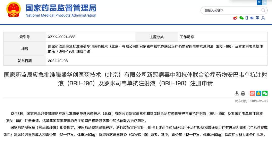 12月8日,国家药品监督管理局官网发布消息,应急批准腾盛华创医药技术(北京)有限公司新冠病毒中和抗体联合治疗药物安巴韦单抗注射液(BRII-196)及罗米司韦单抗注射液(BRII-198)注册申请。