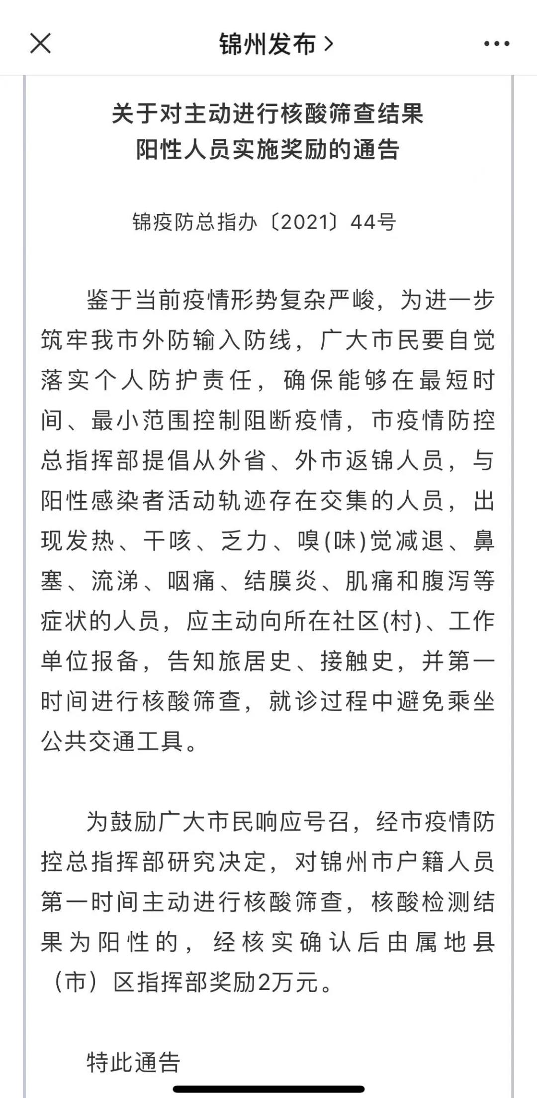 近日,辽宁阜新、锦州接连发布通告表示,对第一时间主动进行核酸筛查,自觉身体不适、主动前往医疗机构发热门诊就诊并说明情况,核酸检测结果为阳性人员,经核实后奖励2万元。