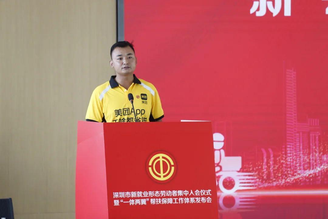 △ 2021年9年,刘亚飞代表新就业形态劳动者在深圳市总工会新就业形态劳动者集中入会仪式暨“一体两翼”帮扶保障工作体系发布会上发言