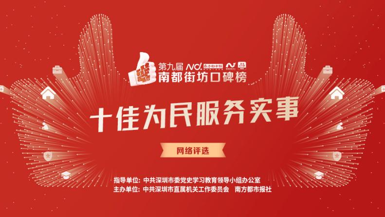 为进一步深入推进“我为群众办实事”实践活动,全面展示深圳市直机关工委系统各单位开展党史学习教育以来办实事的具体举措、工作成效和精神风貌,宣传推广涌现出的先进经验和典型事迹,推动解决基层困难事、群众烦心事,在深圳市委党史学习教育领导小组办公室指导下,深圳市直机关工委联合南方都市报开展深圳市直机关工委系统“十佳为民服务实事”征集评选活动。通过深圳市直机关工委系统各单位党组织自荐的方式征集参选案例,评选范畴涵盖与民生息息相关的内容,包括但不限于教育、医疗、就业、居住、社保、出行、安全、文体、政务、环境等领域。评选结果将在第九届南都街坊口碑榜点赞礼上揭晓。