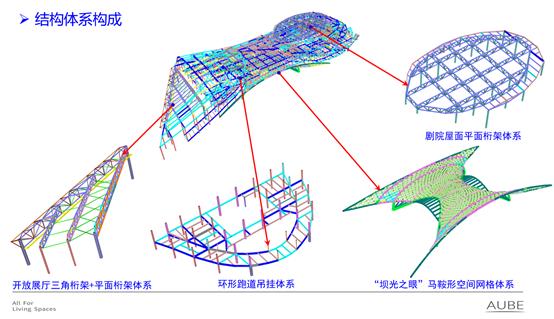 文化中心结构设计对不同部位采取了适应建筑造型需求的结构形式,地下室顶板采用钢筋混凝土主次梁楼盖体系。地上采用全钢结构,开放展厅采用三角桁架+平面桁架作为屋面主要受力构件;剧院采用正交主次平面桁架体系作为屋面主要受力构件;中间采用马鞍形空间网格结构作为上部图书馆部分的转换构件,空间网格下方作为外部连通平台及通道。钢结构与建筑造型的完美结合凝聚成勇立潮头的“坝光之眼”,实现了建筑大跨空间灵活的功能组合和开阔的海湾视野,同时大跨度结构也是绿色建筑的典范。