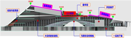 文化中心由深圳市欧博工程设计顾问有限公司设计,总建筑面积43661㎡,主要包含文化馆展厅、综合剧院与图书馆三大功能版块。地下室埋深为6m,剧院升降舞台区域局部地下室埋深11m;地上剧院部分为5层,图书馆及开放展厅部分为3层。开放展厅部分屋面为不上人屋面,采用金属屋面系统,建筑标高从10.600m~15.815m;图书馆部分屋面为上人屋面,采用压型钢板组合楼板,建筑标高为14.400m;影剧院部分屋面为不上人屋面,采用金属屋面系统,建筑标高从22.418m~29.800m。文化中心建筑剖面示意如图:
