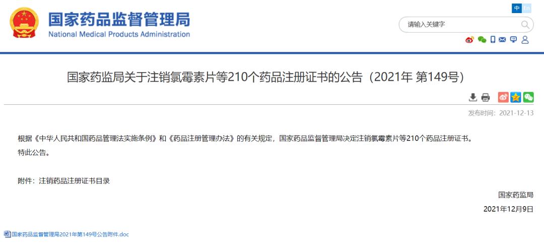 12月13日,国家药品监督管理局官网发布了《关于注销氯霉素片等210个药品注册证书的公告(2021年 第149号)》(简称《公告》),210个药品注册证书被注销,其中包括多款维生素、去痛片、眼药水等常用药。