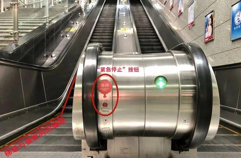 如果发生人员在扶梯上摔倒或扶梯卡夹物品,可以提醒扶梯上人员站稳扶好后,第一时间按压“紧急停止”按钮使扶梯停止运行(非紧急情况请勿按哦),并及时告知车站工作人员处理。